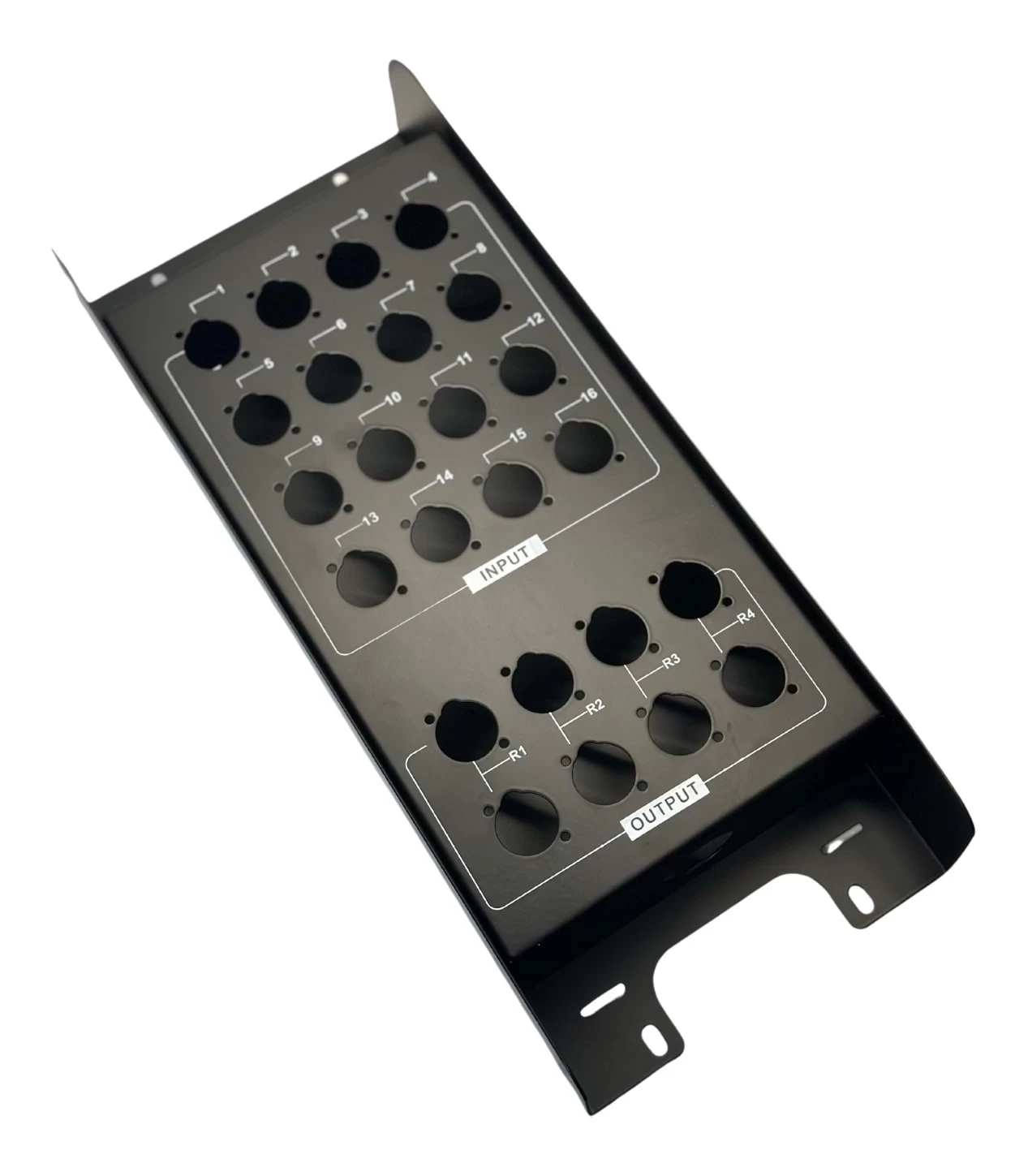 A strong metal build stage box with 20 channel holes punched out and marked 1 to 16, R1 to R4. Suits all panel mount (socket) connectors and is suitable for custom multicores and studio applications.