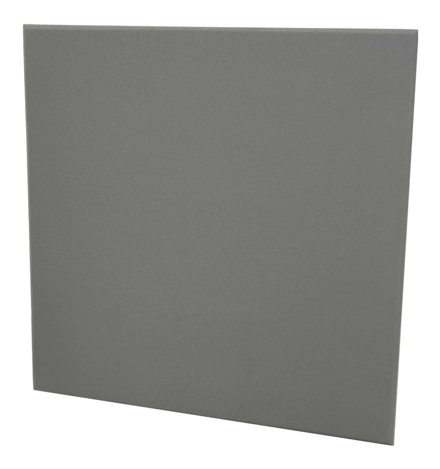 600mm x 600mm Fibreglass Acoustic treatment panel. 26mm thick covering frequency range of 550Hz and above. Light grey fabric covering.