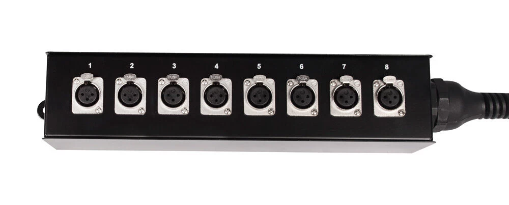 Features a slim style stage box which is great for studio set ups and small stages. Instruments (DI Boxes) and microphones are plugged into the send inputs marked 1 to 8 on the stagebox. The signals are carried through the multicore to 8 corresponding XLR(m) number coded connectors, usually connected to a mixing console.