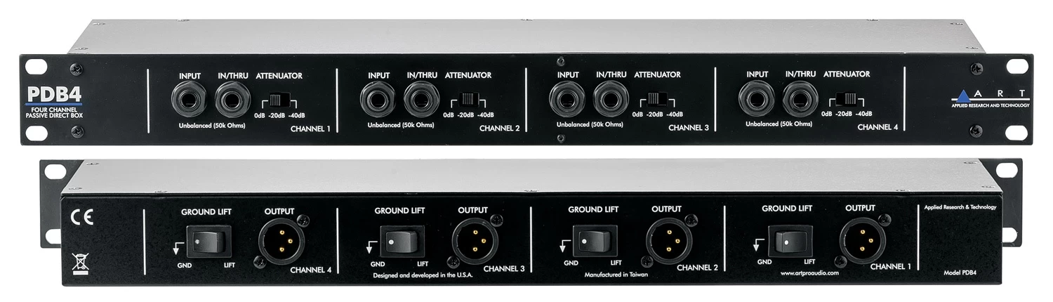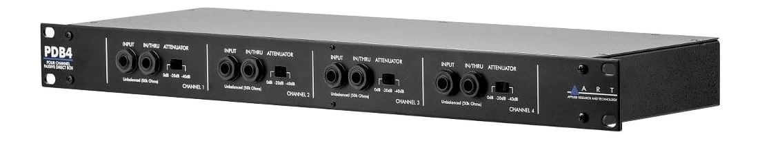 Utilizing totally passive circuitry, the ART PDB4 is a 4 channel rack mountable DI unit, that is ideal for use both in the studio and on stage. This DI provides 4 separate inputs, for connecting 4 individual instrument, line, or speaker level signal into a device that has balanced low impedance inputs such as a mixing desk.