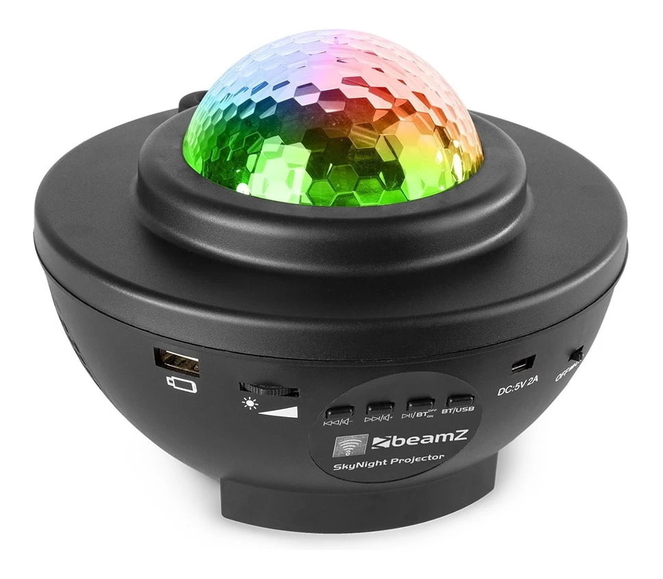The SkyNight projector with built-in multimedia player can light up the entire room in a galaxy pattern along with red and green stars. With the rotating mechanism it also creates a water wave effect in many different colours. This magical effect allows you to enjoy both light and music at the same time, thanks to the built-in speaker. It works with smartphone, tablet (BT streaming) or just insert a USB stick.