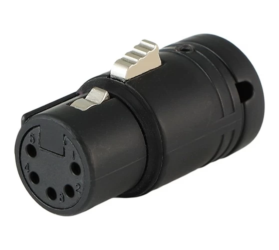 The Cable Techniques CT-AX5F-K is a low profile, right angle female XLR 5-pin connector, allowing you to have a cable exiting 120 degrees at around 3 o’clock or 9 o’clock. Matte black shell, gold pins. Black cap colour. Accepts cable diameters up to 3.4mm