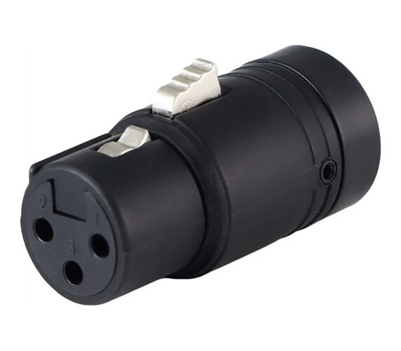The Cable Techniques CT-BX3F-K is a low profile, right angle female XLR 3-pin connector, allowing you to have a cable exiting 120 degrees at around 3 o’clock or 9 o’clock. Matte black shell, gold pins. Black cap colour. The large cap accepts cable diameters from 3.8mm to 6mm.