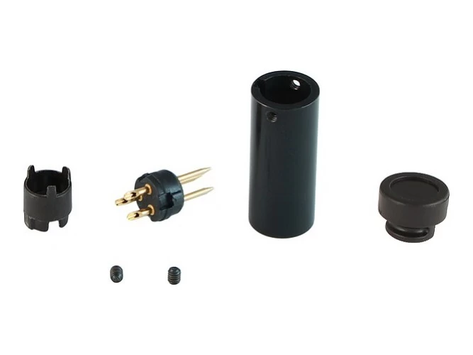 Matte black shell, gold pins. Black cap colour. Accepts cable diameters up to 3.2mm.