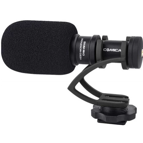 The black shockmount CVM-VM10 II Micro Compact Directional Condenser Microphone from Comica Audio is a lightweight, all aluminum microphone with a supercardioid polar pattern designed for use with DSLRs, smartphones, and camcorders. It can be used to capture audio for professional video recordings and broadcast TV applications.