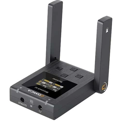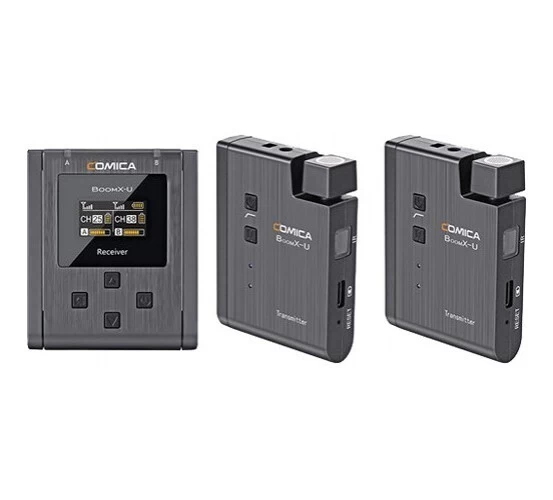 Ideal for DSLR cameras, video cameras, and mobile phones, the COMICA BoomX-U is a broadcasting-level mini UHF wireless microphone system, featuring two wireless transmitters and a dual wireless receiver. Internal and external mic 2-input modes.
