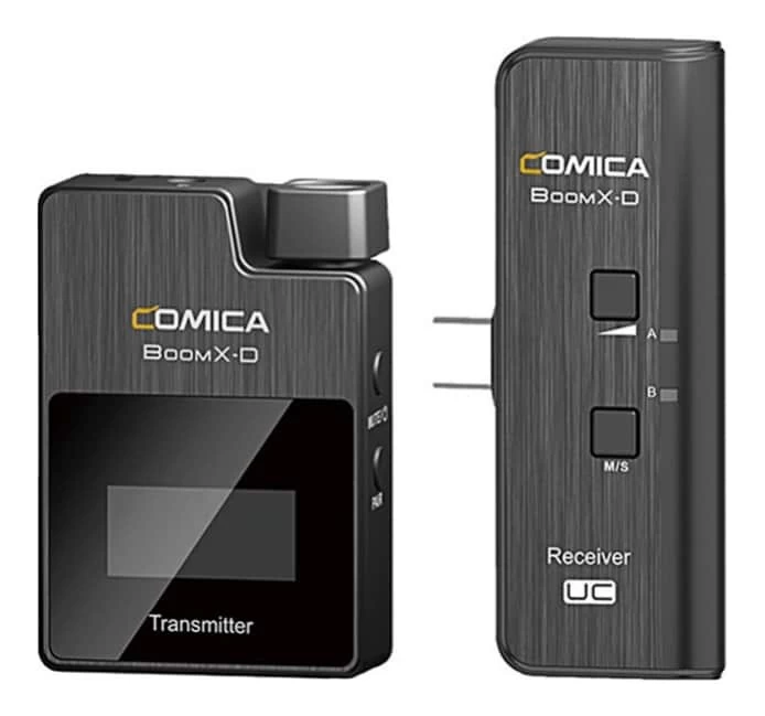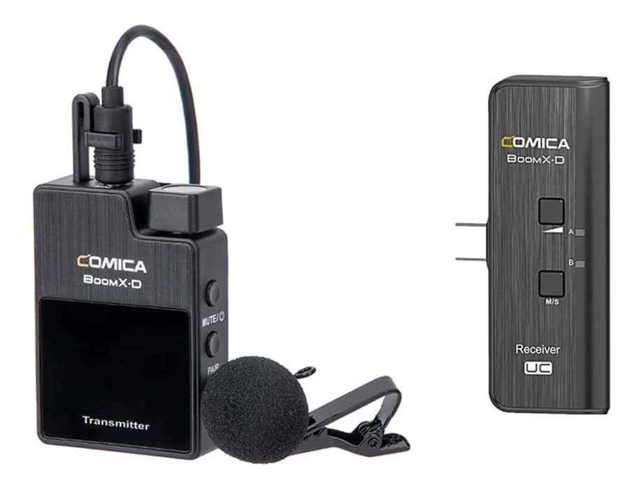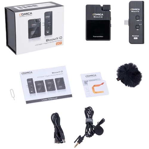 The COMICA BoomX-UC1 is a wireless digital microphone system for Android smartphones and USB Type-C devices. It features a lapel microphone with transmitter and a dual-channel receiver. Real-time audio monitoring, broadcast quality, and up to 50m range.