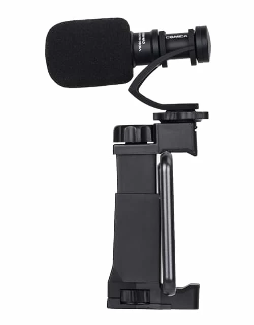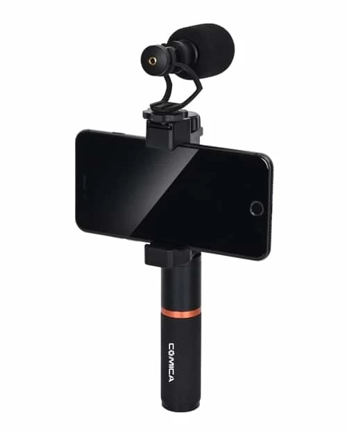 The COMICA CVM-VM10-K smartphone grip handle video rig with a cardioid directional shotgun microphone is ideal for mobile videos, vlogs and live streaming, providing clear sound for iOS/Android smartphones. Kit includes clamp, grip handle, and shockmount.