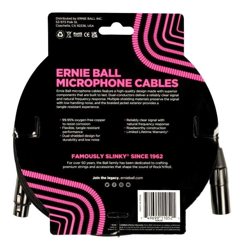 The Ernie Ball 6391 15′ Braided XLR Microphone Cable in Black. Ernie Ball microphone cables are ultra durable, tangle resistant, and are built with a noise-free design using superior components. Dual-conductors deliver a clear signal. Braided jacket.