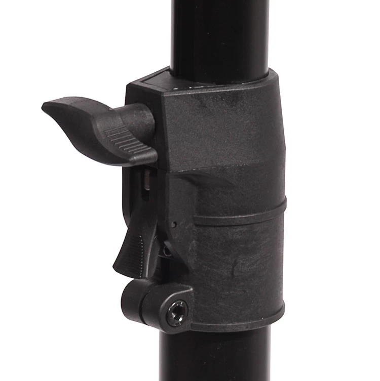 This stand features an automatic pin locking mechanism, with a simple thumb-press button for releasing the button. Enables a faster setup time, more stylish look and no chance of the locking pin going missing.