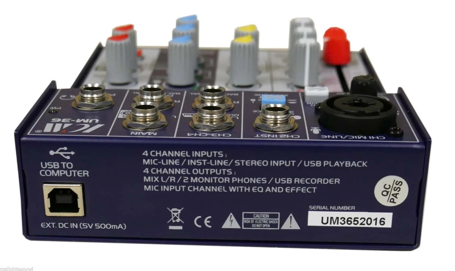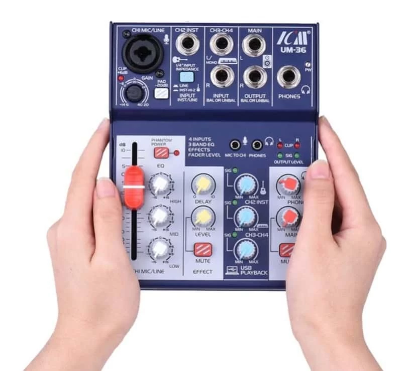The UM-36 is a compact, portable 4-Channel mixing desk with USB interface making suitable for recording, live performances, karaoke singing and conference rooms. With 1 mic preamp, stereo balanced jacks, and Hi-Z guitar input, it is ideal for musicians.