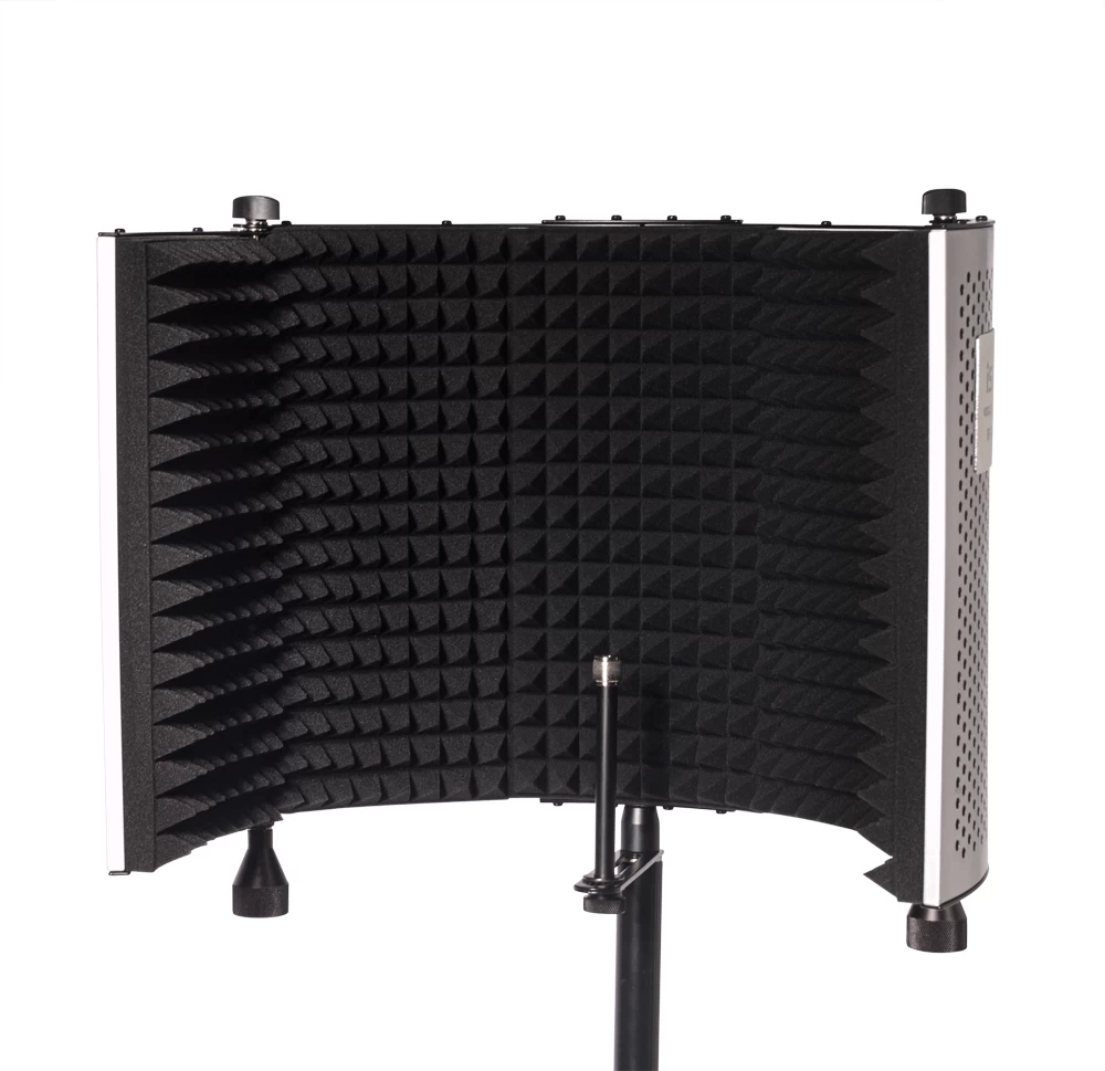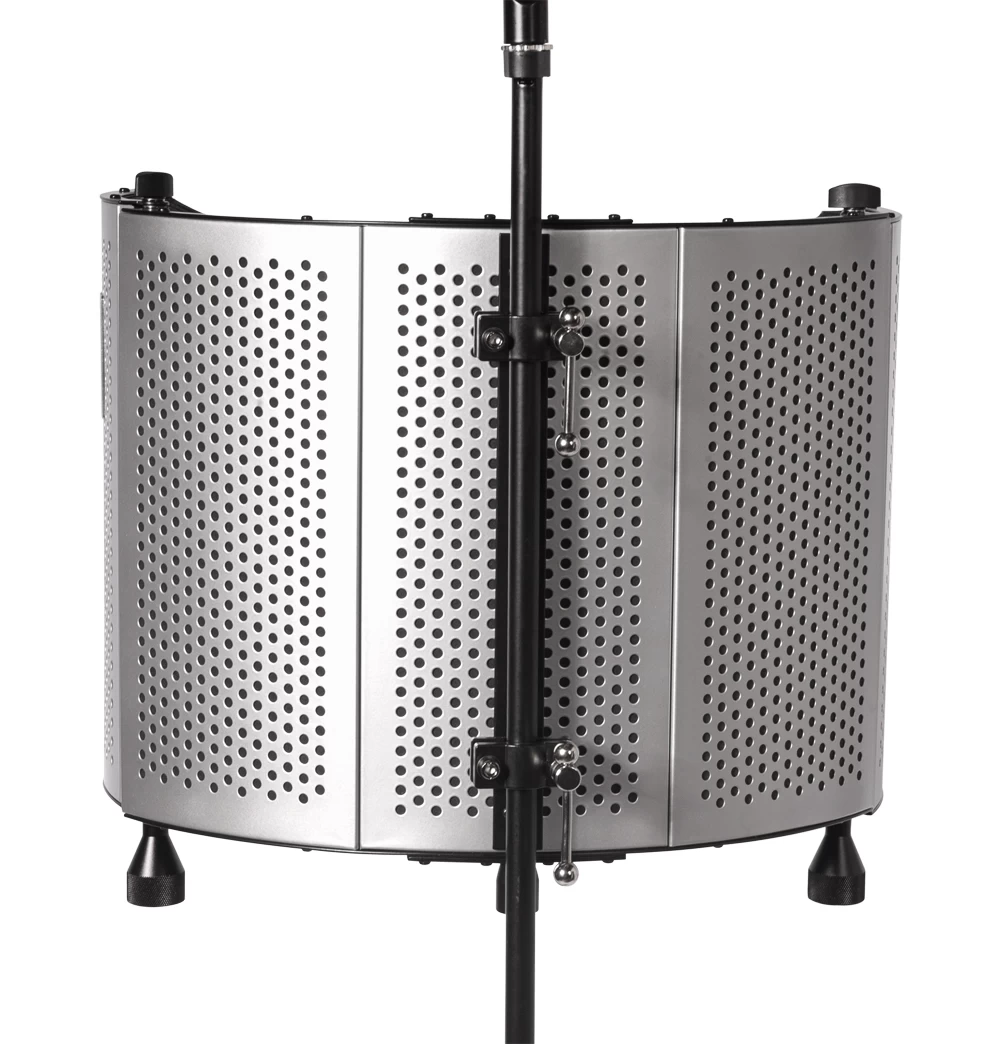 - Consists of 5 pieces of high quality professional sound-absorptive metal panels (the 3 center panels are stationary – the 2 side panels are foldable), it is easy to adjust the recording area depending on the situation