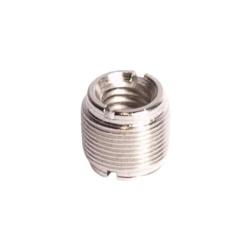A 3/8″ to 5/8″ mic clip thread adapter, designed to be placed onto mic stands with 3/8″ threads. This allows a standard 5/8″ thread mic clip to be mounted on these stands. Strong, well machined metal threads, with a groove at either end for removing the adapters with a screwdriver.