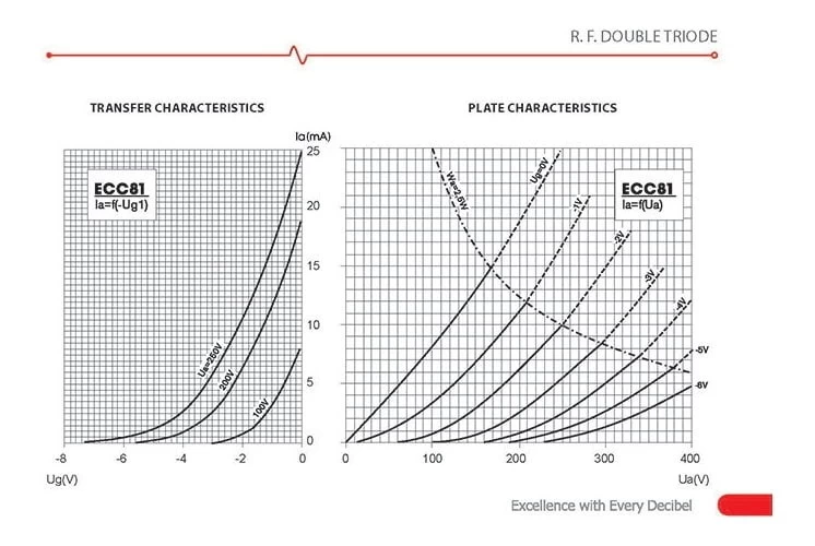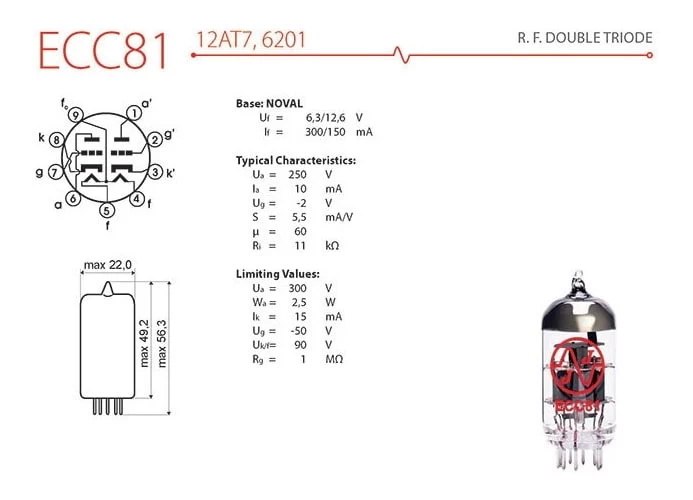 The JJ Electronic’s ECC81 is a 12AT7 medium gain pre-amplifying double triode. Featuring lower gain, with more drive, they can be also used as replacement for 12AX7 in many applications. Good for phase inverters or reverb drivers. Very smooth and warm sound.