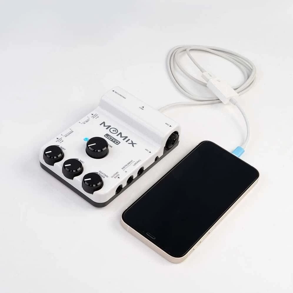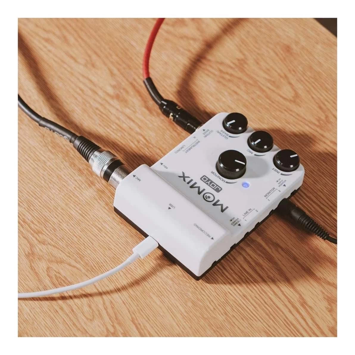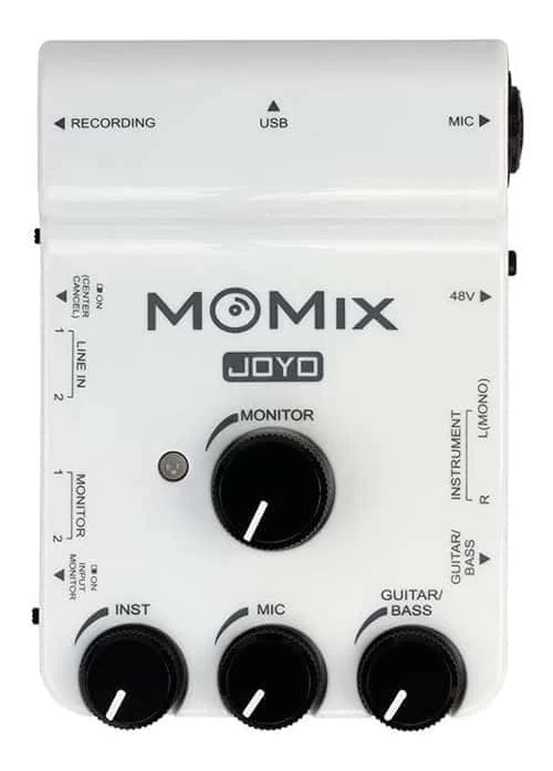 The JOYO MOMIX is ideal for recording and live streaming from your smartphone or tablet. You can connect it to a microphone, guitar/bass, keyboard, electronic drum sets and more. Useful as a live audio mixer. Centre cancel switch, 48v from device.