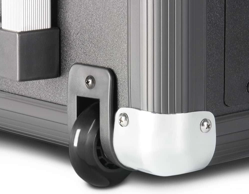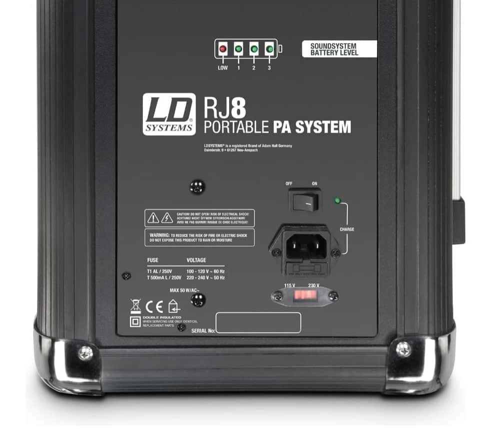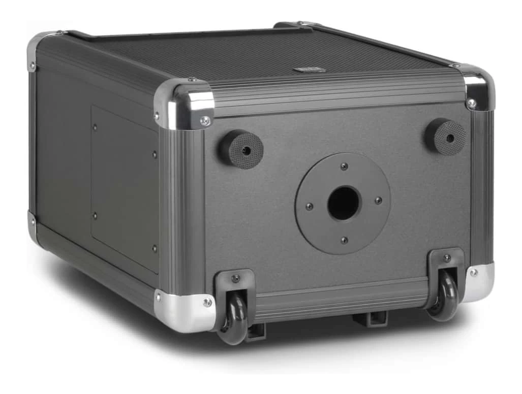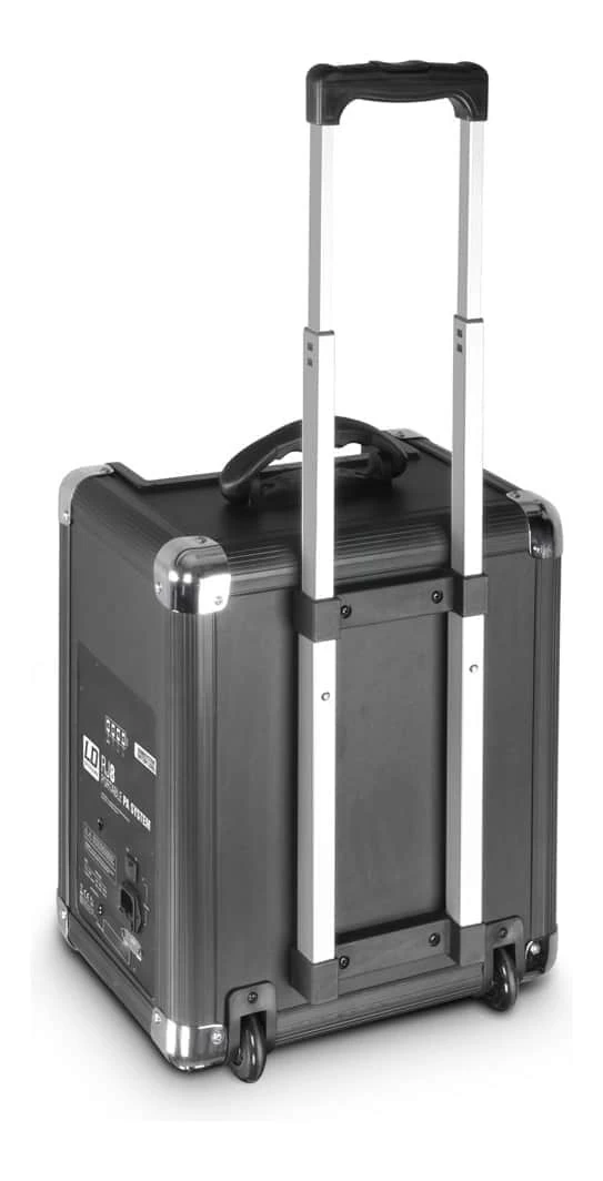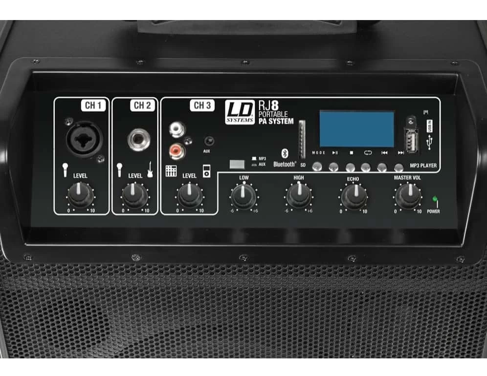 The LD Systems Road Series 8″ active 2-way system takes your sounds anywhere. With built-in wheels and extension handles for carting convenience the LDRJ8 features a 90 Hz – 18 kHz frequency range and 100 watts peak output. A rechargeable battery pack provides up to 20 hours of continuous operation. The integrated mixer has 3 channels with individual volume control, a 2-band EQ plus an echo and master volume. Combo, 6.3 mm TRS jack, RCA and 3.5 mm TRS mini-jack connectors allow for a wide variety of input sources. The LDRJ8’s major feature is a built-in Bluetooth player that permits wireless streaming to the system. It also supports SD card and USB storage devices. The player menu includes multiple genre-specific presets for instant EQ adjustment.