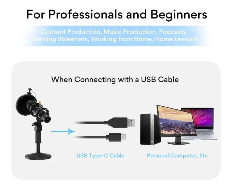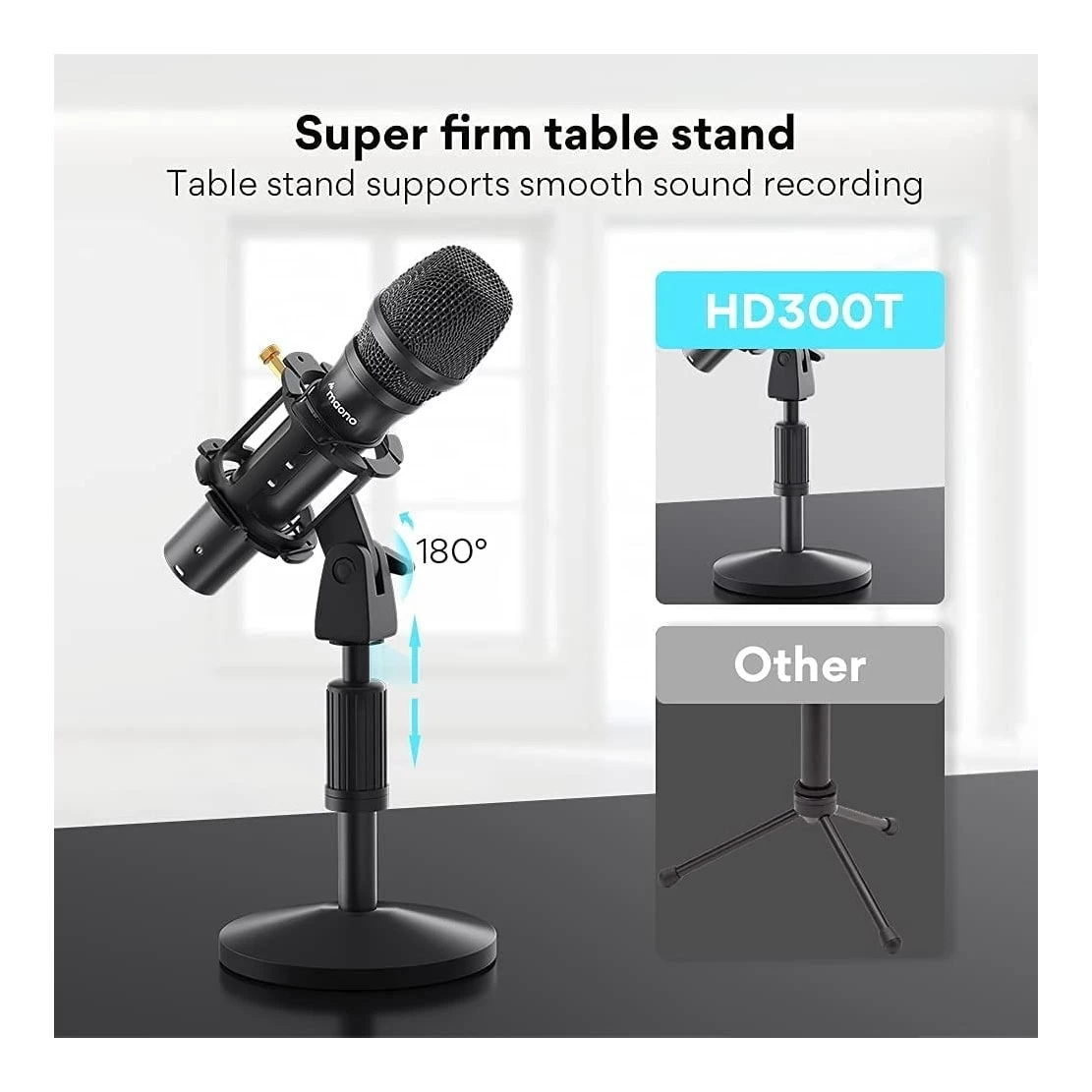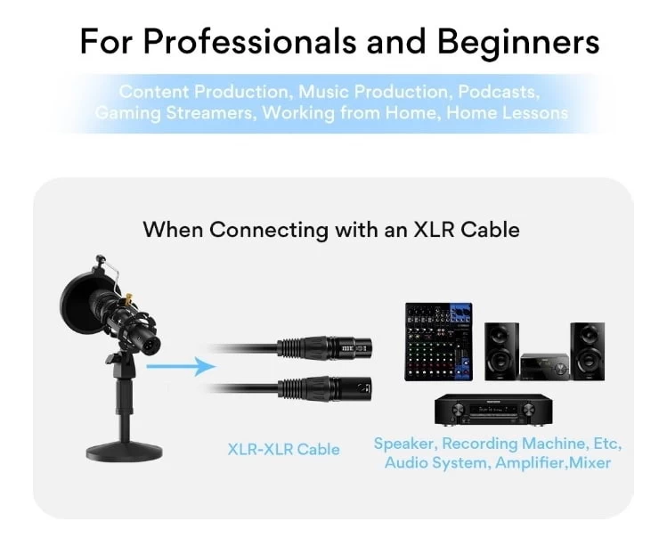 The HD300 can be connected to more devices such as PCs, computers, DJ mixers, and audio interfaces, portable PA systems. The great thing is that HD300T studio mic doesn’t require phantom power. Premium components and extremely sturdy construction deliver clear and natural sound, all in one mic kit Includes a durable desk stand that doesn’t slip easily, takes up a small desk area, a pop filter for p-pops reduction, a shock mount for vibration reduction, to ensure better recording. The Built-in cardioid capsule can capture sound in front of the microphone and reduces possible background noise from the other side and rear. Smooth, extended frequency response for rich and natural vocal reproduction.