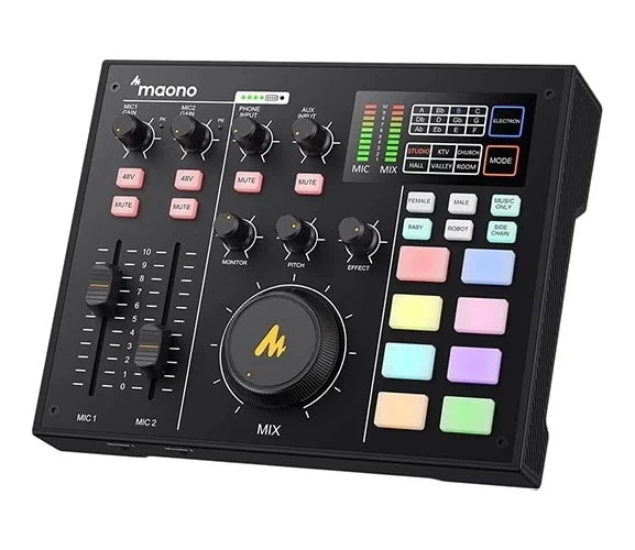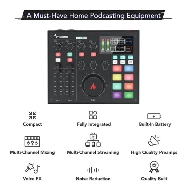 It offers four channels of audio mixer and easy connections to microphones, smartphones, PC, Mac, and other sources; Advanced engineering that allows the user to control the sound levels and add live vocal and sound effects through a comprehensive set of tools to avoid difficult post-production and editing. Built-in rechargeable battery for even more portability. This audio interface has 6 reverb modes, auto-tune, and 4 pitch changers. Each microphone input is independently controlled and can be muted with one tap. Pro features like sidechain, mix-minus, noise-canceling, and loopback switch are also included. All seven jingle pads are programmable with our PC/Mac APP. We have preloaded four audio effects. You can upload any audio effects you like to the MAONOCASTER. In addition, there is a cough button so you can let it all out while keeping your content clean!