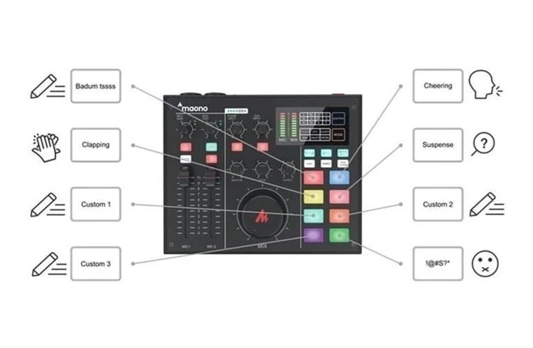 - 4 sound FX preset pads, and 3 programmable pads to upload your own sound FX or jingles using the Maonocaster app