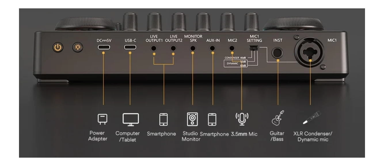 – Drive the high-end dynamic microphones, XLR condenser mic, and 3.5MM condenser mic for ultra-clear sound.