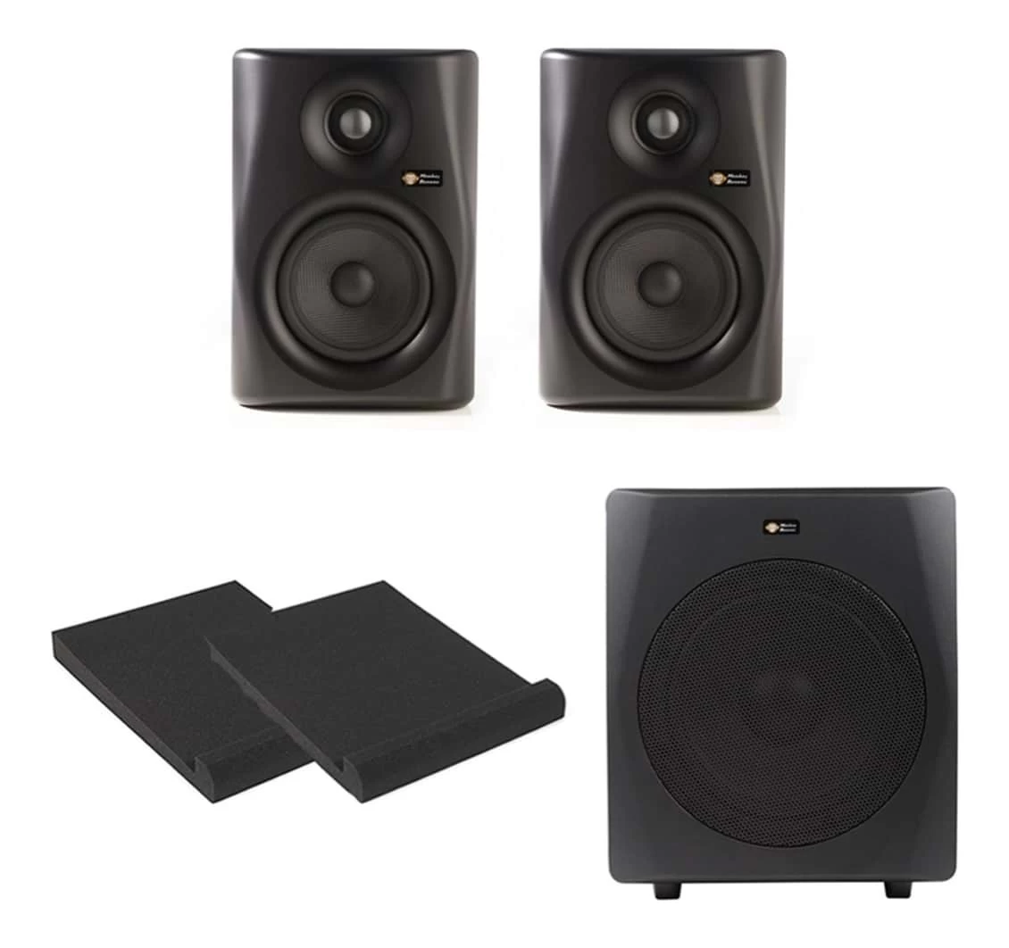 The renowned, high quality Monkey Banana Gibbon Series 5″ studio monitors are paired with the active 10″ subwoofer, and isolation pads. An acclaimed series of transparent studio monitors, producing detailed low frequencies and superior stereo imaging.