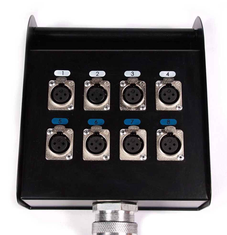 Features 8 XLR balanced send channels. Instruments (DI Box) and microphones are plugged into the send inputs marked 1 to 8 on the stagebox. The signals are carried through the multicore to 8 corresponding XLR(m) number coded connectors. Typically used to connect performers on stage or in a recording studio to a mixing desk.