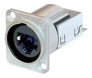 The Neutrik NE8FDV-C6 is a vertical PCB panel mount with an RJ45 receptacle, featuring a D-shaped metal flange with latch lock, suitable for replacing or supplying control panels that require a Cat6 connection.
