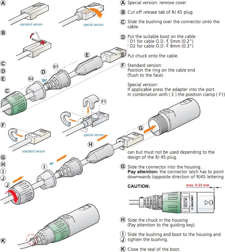 - Allows assembly of preassembled conventional RJ45 cables