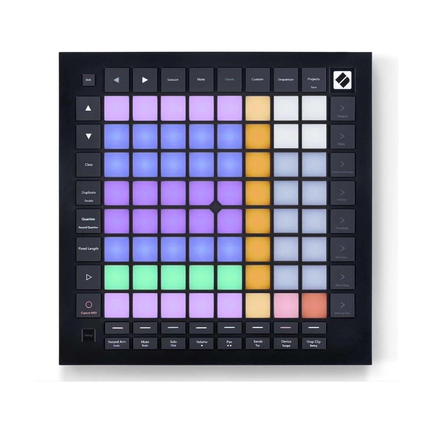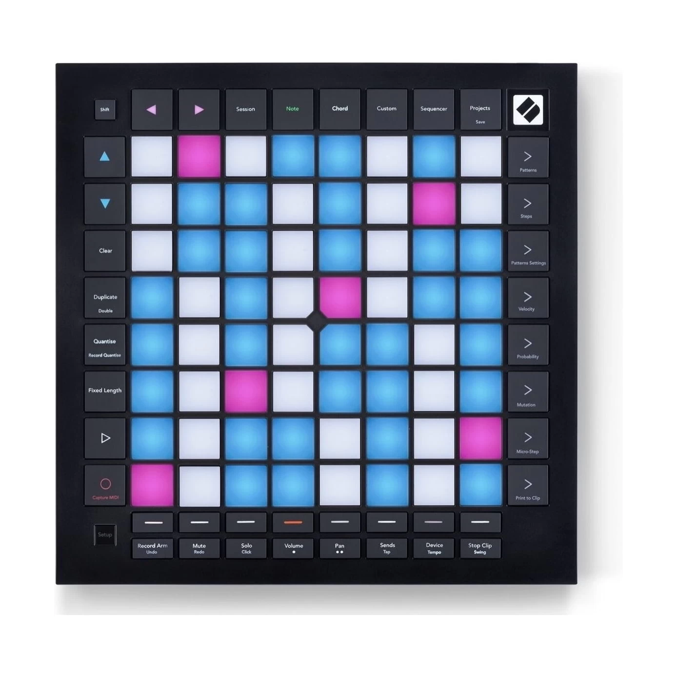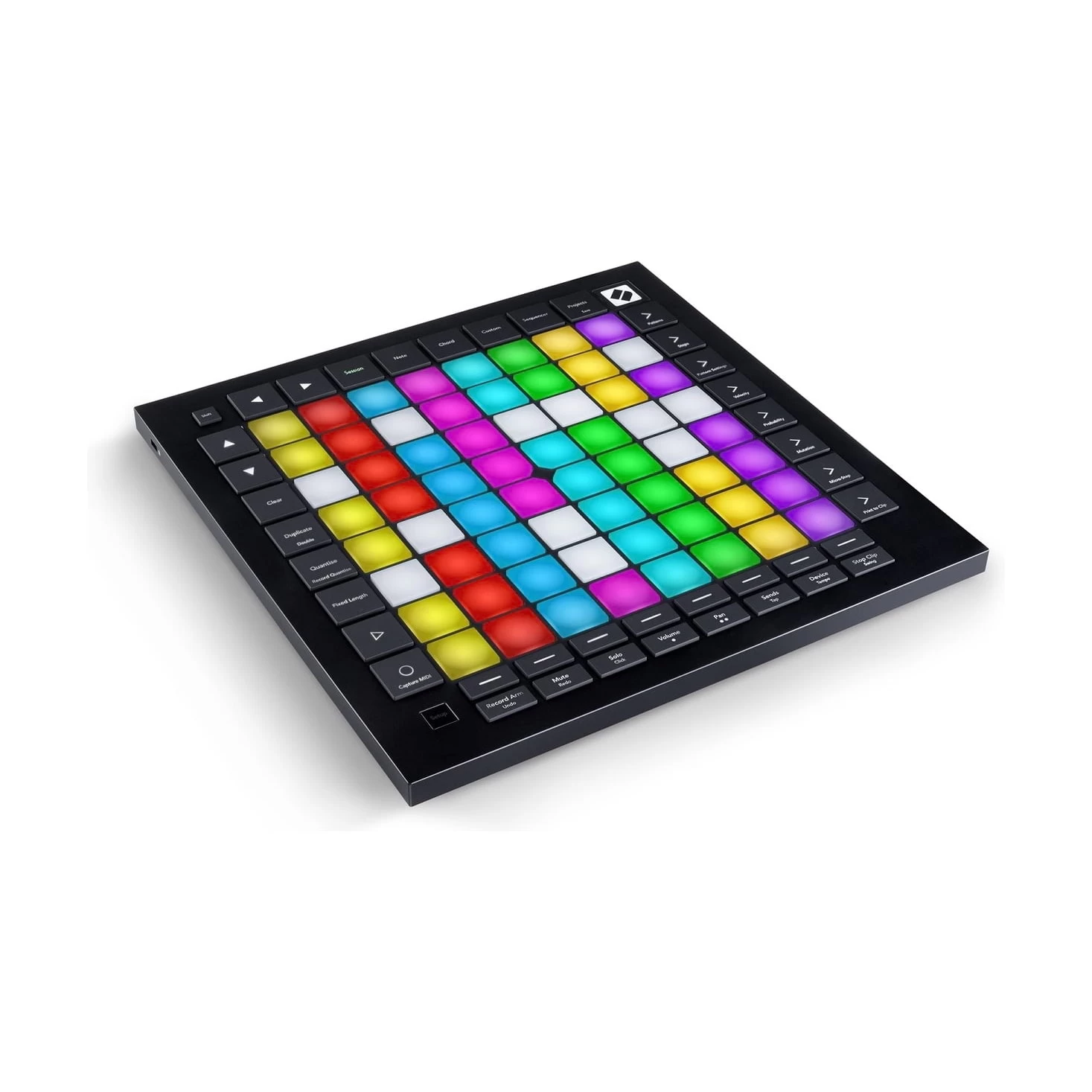 The most advanced Novation grid controller for producing with Ableton Live. Launchpad Pro has dedicated buttons that get you closer to the Ableton Live workflow. Launch clips and scenes, access mixer, device and transport controls, and quantise, duplicate and double, all without touching your mouse. Capture MIDI makes sure you never miss an idea. The Launchpad Pro’s velocity- and pressure-sensitive pads are bigger and more responsive than ever — perfect for playing grooves and launching clips. Scale mode locks pads to a musical key so you never hit a wrong note. Chord mode is an inspirational tool for building harmonies.