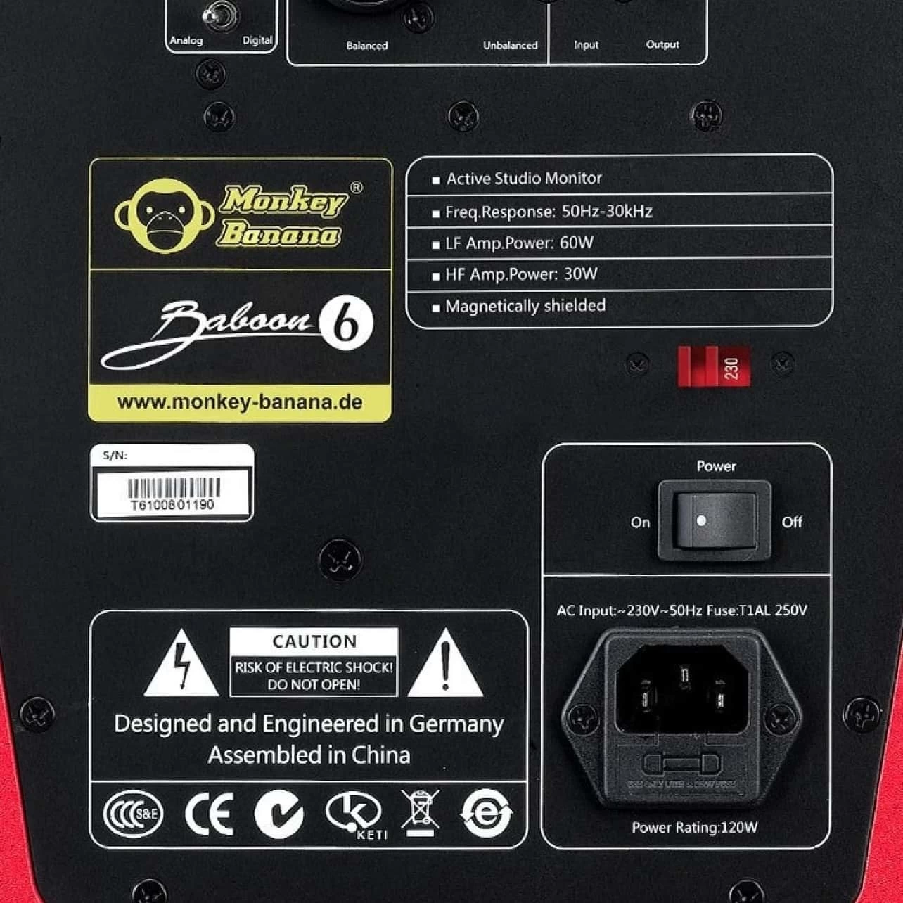 The Baboon 6 features a 4750mm² air motion transformer tweeter and a special 6.5“ kevlar weave woofer. The special tweeter allows for even further transparency and higher resolution in the high frequency range. The Baboon 6 offers versatile application possibilities for near field monitoring, allowing for postioning quite close together however the stereo imaging is fabulous. The amplification power of the bi-amp-module is 60 watts for the low-frequency range and 30 watts for the high-frequency range. The frequency response from 50Hz to 30 kHz.