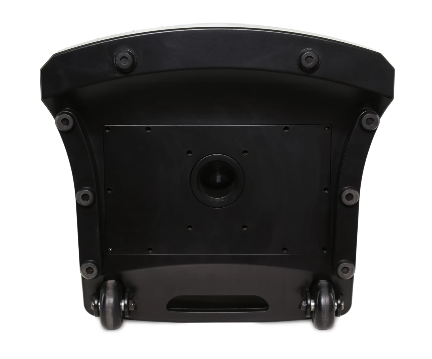 With a handle and wheels, it is extremely portable, weighing in at just under 19kgs. Complete with dual handheld wireless PAH330 microphones, and built in receivers, there is still room for expansion into the unit. The mixer section on the back features numerous inputs and outputs and there are also separate bass and treble control knobs. This speaker can be mounted on a standard 35mm speaker pole