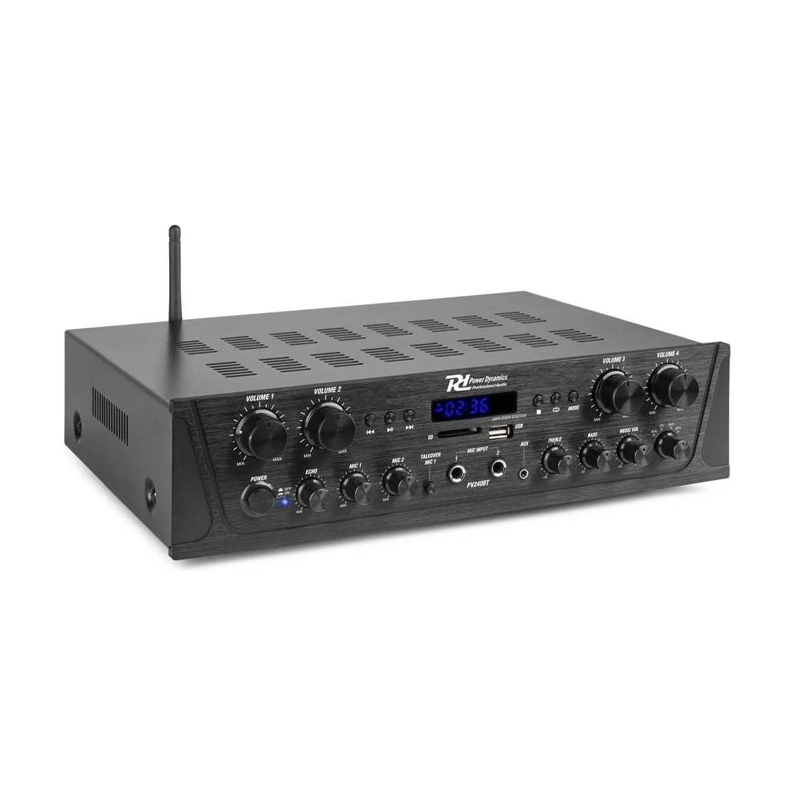 The Power Dynamics PV240BT is a smart 4-Channel 400W Amplifier, which features Bluetooth streaming, USB/SD playback FM Radio and microphone inputs. It provides power to 4 pairs of speakers, provide 8x 50W, with 4 individual zones. Include remote control.
