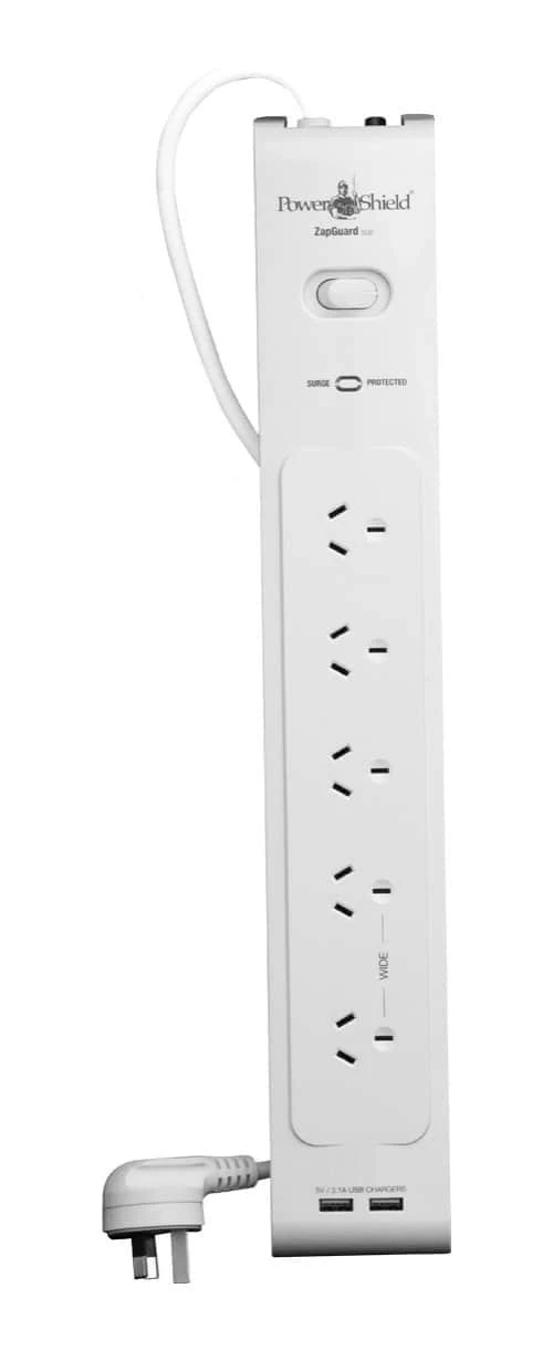 This Powershield Zapguard Surge Protected 5 Way Power Board with 2 USB ports will protect your home and office electronics from dangerous surges and spikes and is ideal for charging mobiles, laptops and other small USB powered devices. It is highly rated to withstand power surges and spikes of up to 1,400 Joules / 40,000 Amps. It features a wide spaced socket to allow for plug packs and also has the option to be wall mounted.