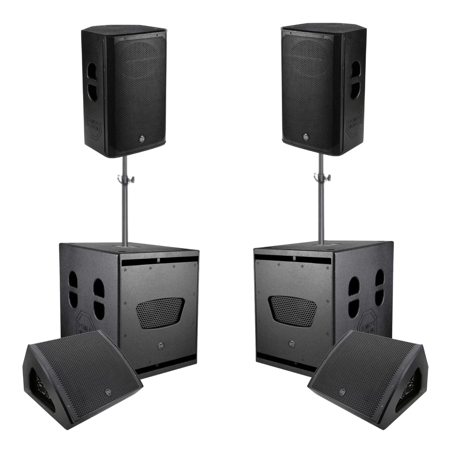 SWAMP has tailored this powerful PowerWorks package specifically for professional musicians, bands, and venues playing live music. Included are 2x 15″ Subwoofers, 2x 12″ Bi-amped top boxes, and 2x 12″ monitors, mounting poles and quality cables, for a total RMS of 3800W