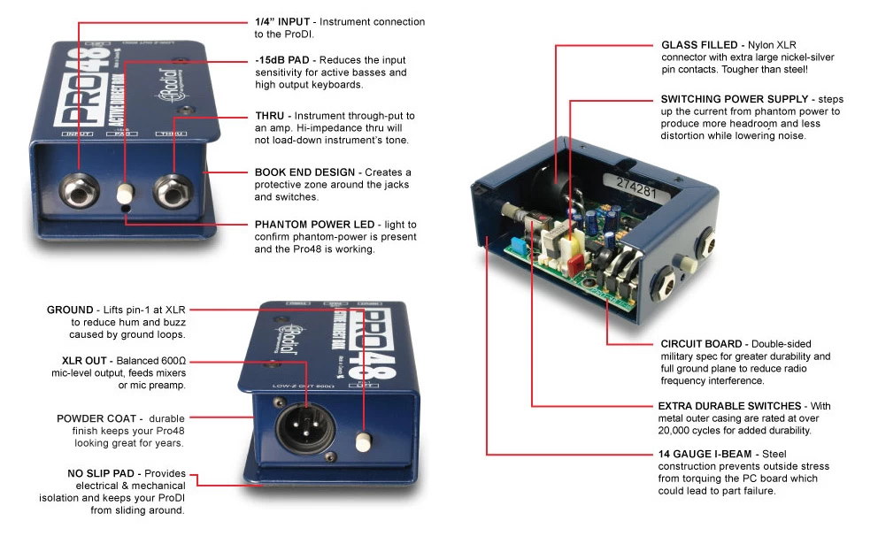 The Pro48 is constructed from 14 gauge steel in Radial’s unique book end design, that ensures added protection around all the switches and connectors. An internal beam supports the internal PC board, taking any additional pressure off the important internal components. The rubber provides extra isolation from vibration and protection from wear and tear.