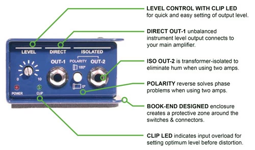 The X-Amp handles level and impedance conversion with an active Class-A circuit which reproduces all the tones and inflections of the original performance. X-Amp drives guitar amps as if the player was still plugged into it! X-Amp accepts a balanced +4dB line-level signal and outputs two unbalanced instrument level signals that can connect to effect pedals and amps. To prevent ground loops between the recorder and the amps, the input features a ground lift. X-Amp allows simultaneous use of two amps. The second amp output is buffered to prevent signal loss, transformer-isolated to eliminate hum caused by ground loops and features a polarity reverse to align out-of-phase amps. The output level control and clip LED aid in setting levels quickly and saves you many trips back and forth between the mixer and amps. Finally, the X-Amp is packaged in an innovative and tough 14 gauge steel welded I-beam enclosure that makes it impossible to torque the PC board.