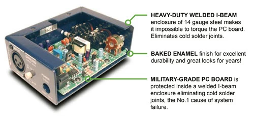 As with all Radial products, the X-Amp is built like a tank to provide years of trouble-free performance. An internal I-beam skeleton provides maximum protection against external stress which could cause solder points to fail. This is supplemented with an innovative bookend design that creates a protective zone around the switches, potentiometer and connectors. A full bottom no-slip pad performs double duty by keeping the X-Amp from sliding around when placed on a vibrating amplifier while also providing electrical and mechanical isolation. Reamping works equally well on bass, keyboards, drums and voice. Once you start Reamping, you will never record any other way.