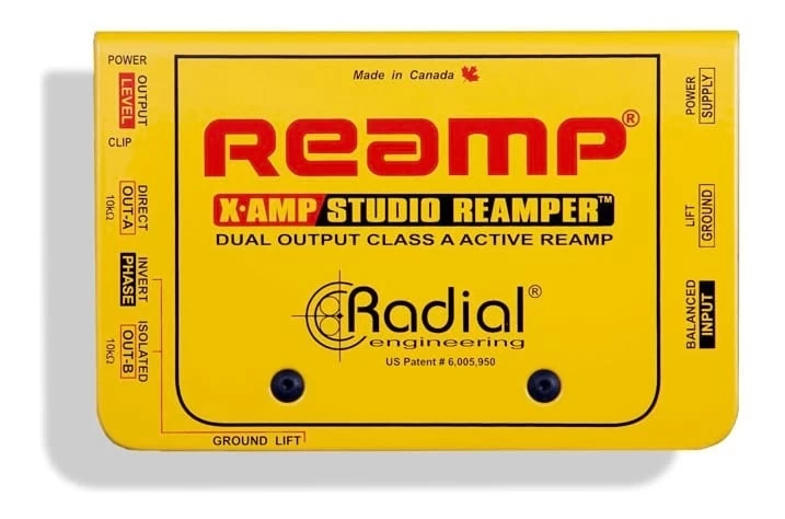 The Radial X-Amp is an active re-amper that allows a track from a multi-track recorder to be played through a guitar amplifier(s) and re-recorded. Players and engineers can experiment with different combinations of amps and effect pedals long after the original performance has been recorded to build the thickest and chunkiest guitar tracks.