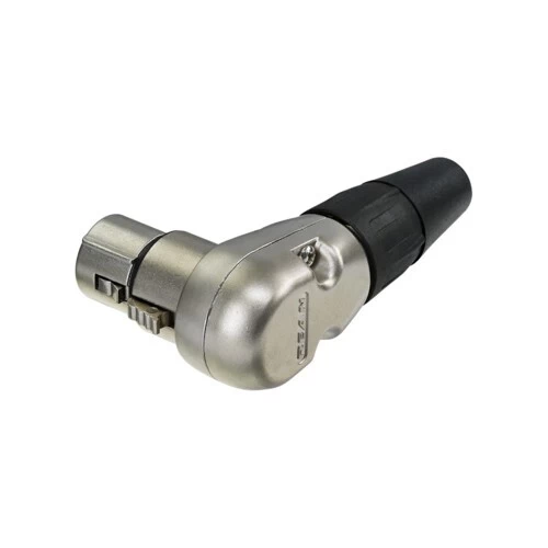 Genuine right-angled RC3FR REAN XLR(f) audio connector. This is a single female XLR connector used to transfer a balanced signal via 3 pins through an audio cable. Nickel housing, 3-pole stereo / balanced connector.