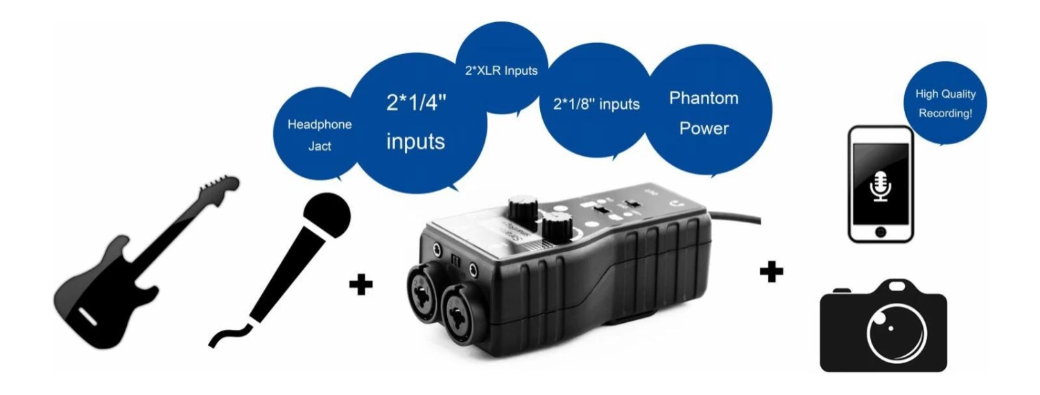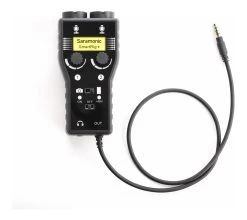 The Saramonic SmartRig+ is a 2 channel portable microphone / guitar interface for recording professional quality audio to any smartphone or video camera.