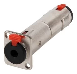 A 1/4″ female to female feed-through TRS jack adapter featuring solid rubber ends, reliable locking mechanism, metal housing and is able to be panel mounted. Used to easily connect cables, this adapter offers a time saving solution to patching, with no soldering required. The pass-through style allows direct connection of 1/4″ jack stereo or mono cables in audio rack set ups where patch panels are commonly used. Designed for plugging instruments such as guitar, keyboards, or computer audio directly into the patch panel and connecting to another device or mixing desk.