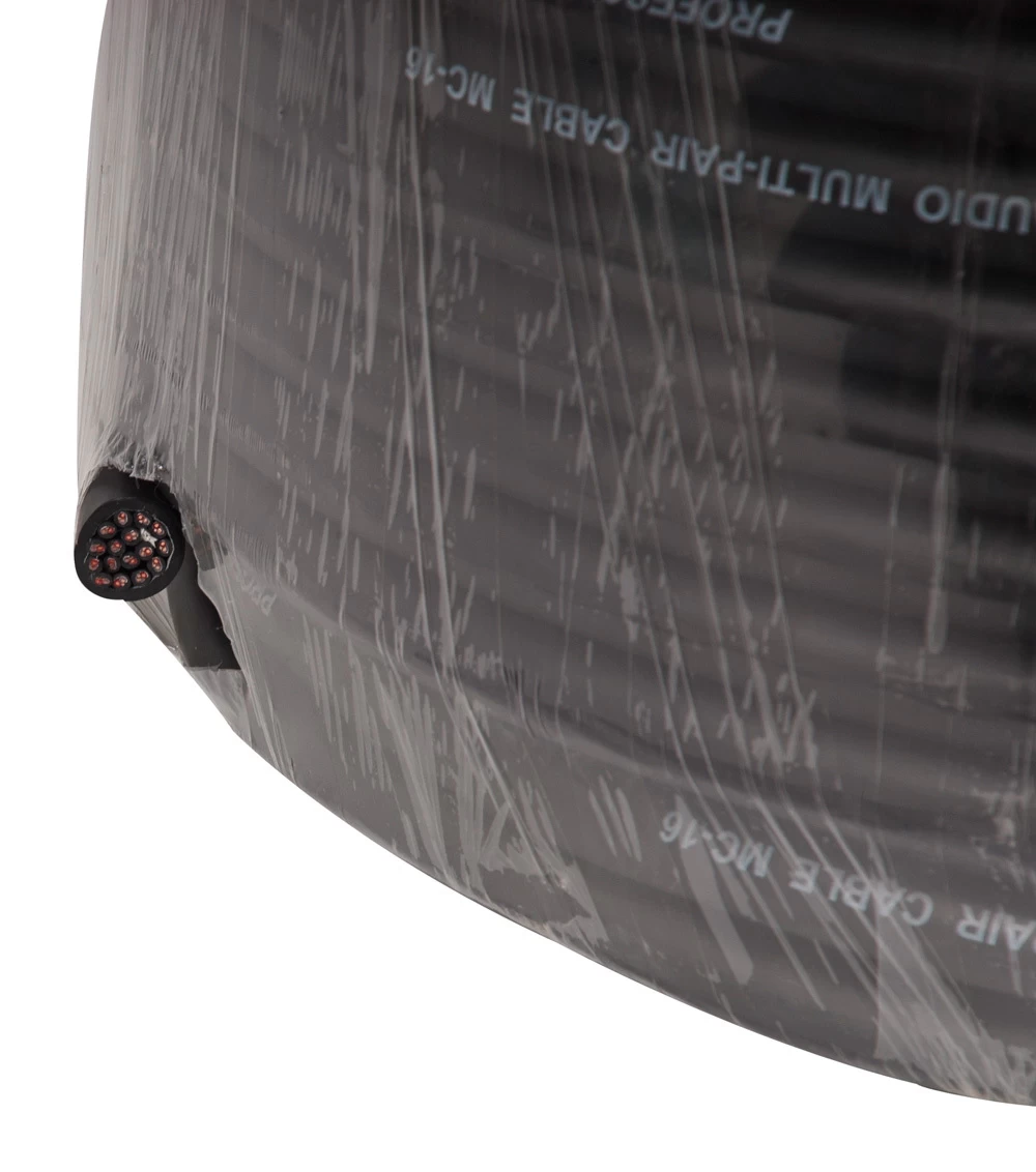 Each channel consists of a twisted pair of OFC conductors, wrapped with a spiral wrapped copper ground wire and outer aluminium foil shield, then encased in a PE jacket. All channels are then bound inside a tough black outer PVC jacket. Each channel has its number labelled on its PE jacket. Designed to carry balanced mic and line level analog audio signals.