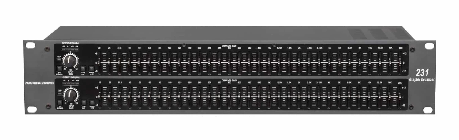 Graphic EQ’s are essential for live sound engineering, and are a vital tool for PA systems in any acoustic space. They are used to treat a Main Mix or Foldback Monitor output signal and tailor the sound to suit the room. An Equalizer provides the means to “cut” or reduce frequencies that may cause feedback on stage, or in the room, and eliminate unpleasant and harmful frequencies in the PA system.