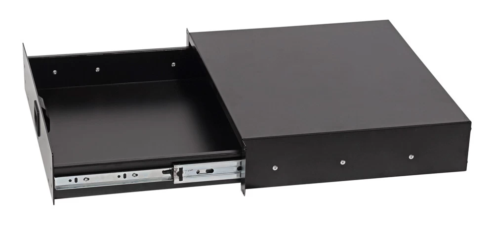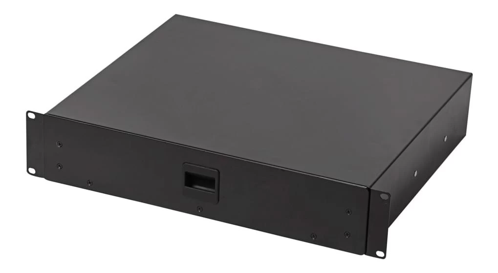 A rack mountable storage drawer, useful for holding cables, small devices and audio accessories. A great way to utilize the unused slots of your rack case or rack frame. Takes up 2U of space on a standard 19 inch rack case.
