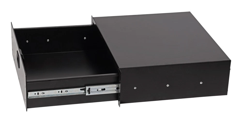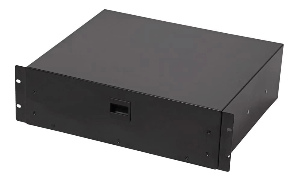 A rack mountable storage drawer, useful for holding cables, small devices and audio accessories. A great way to utilize the unused slots of your rack case or rack frame. Takes up 3U of space on a standard 19 inch rack case.