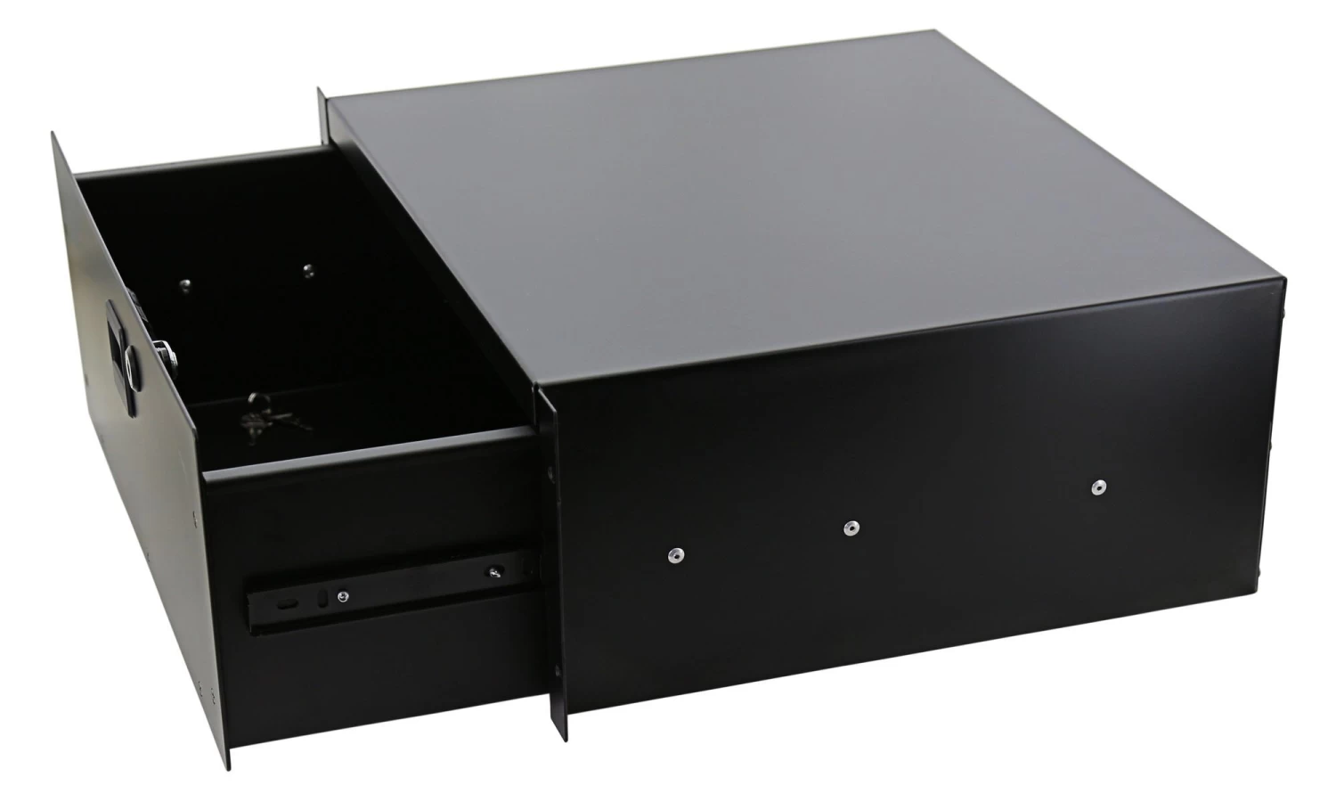 A rack mountable storage drawer, useful for holding cables, small devices and audio accessories. A great way to utilise the unused slots of your rack case or rack frame. Features smooth sliding rails. Takes up 4U of space on a standard 19 inch rack case.