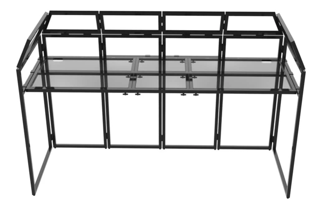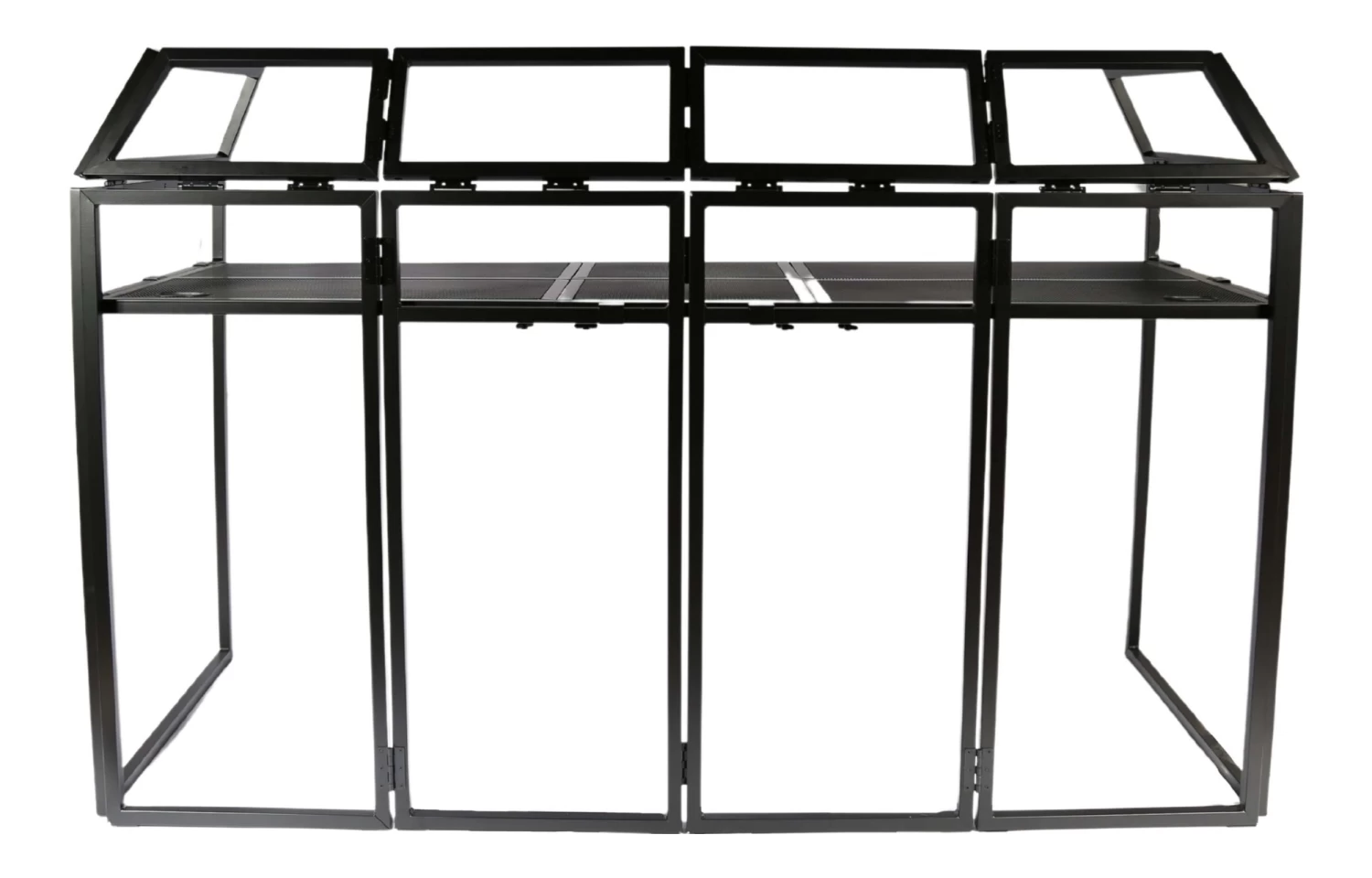 Although an ideal DJ or disco booth, this could also work a popup front-of-house mixing booth as well. The maximum evenly distributed weight that the metal shelf can hold is 25kg. The bevelled top pieces also mean curious punters can’t easily disturb you and get too close with their drinks. The system can be lit up from behind using a vast array of light effect (not included).
