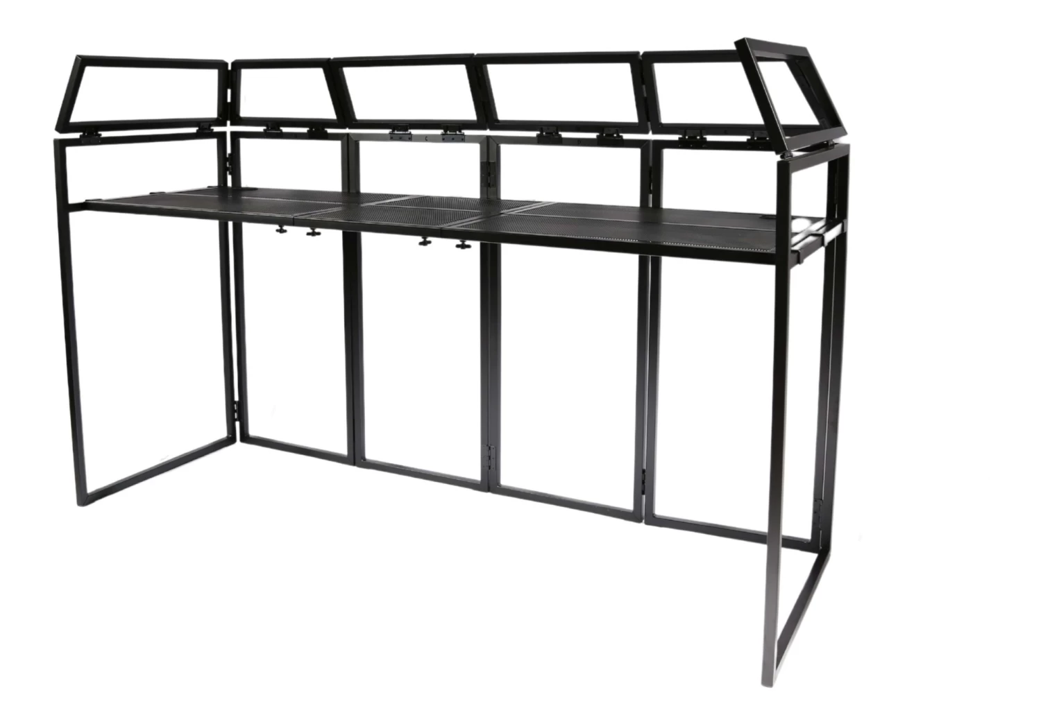 A wide, pro DJ booth or FOH console stand, perfect as a lightweight, transportable sturdy solution. It features a 2m wide metal shelf with cable cutouts, heavy duty white and black lycra scrims, and a handy carry bag. Easy to setup and start gigging
