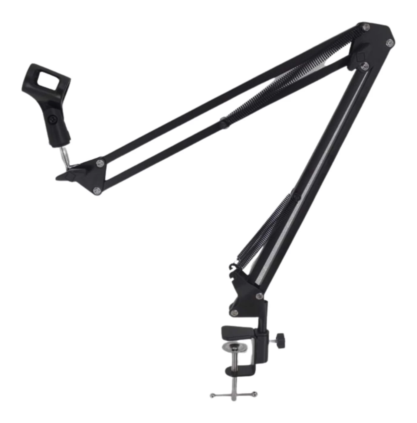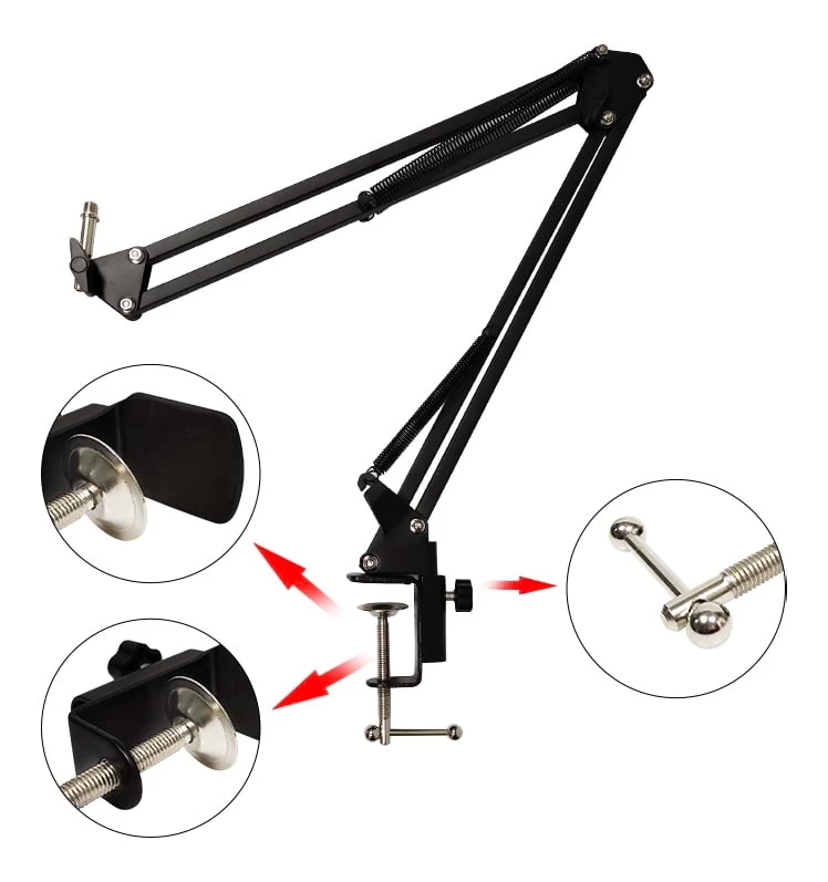 This SWAMP Mountable Broadcast Boom Arm Stand is a convenient and compact stand, made with high quality steel, and is sturdy and durable. With its 2-arm design, it is easy to attach, flexible and practical. Mount on a desk with the included clamp. Adjustable & folding arm and swivel table mount for easy mic adjustment. Featured are durable dual suspension springs on each boom arm. It is a compact size for ease of portability.