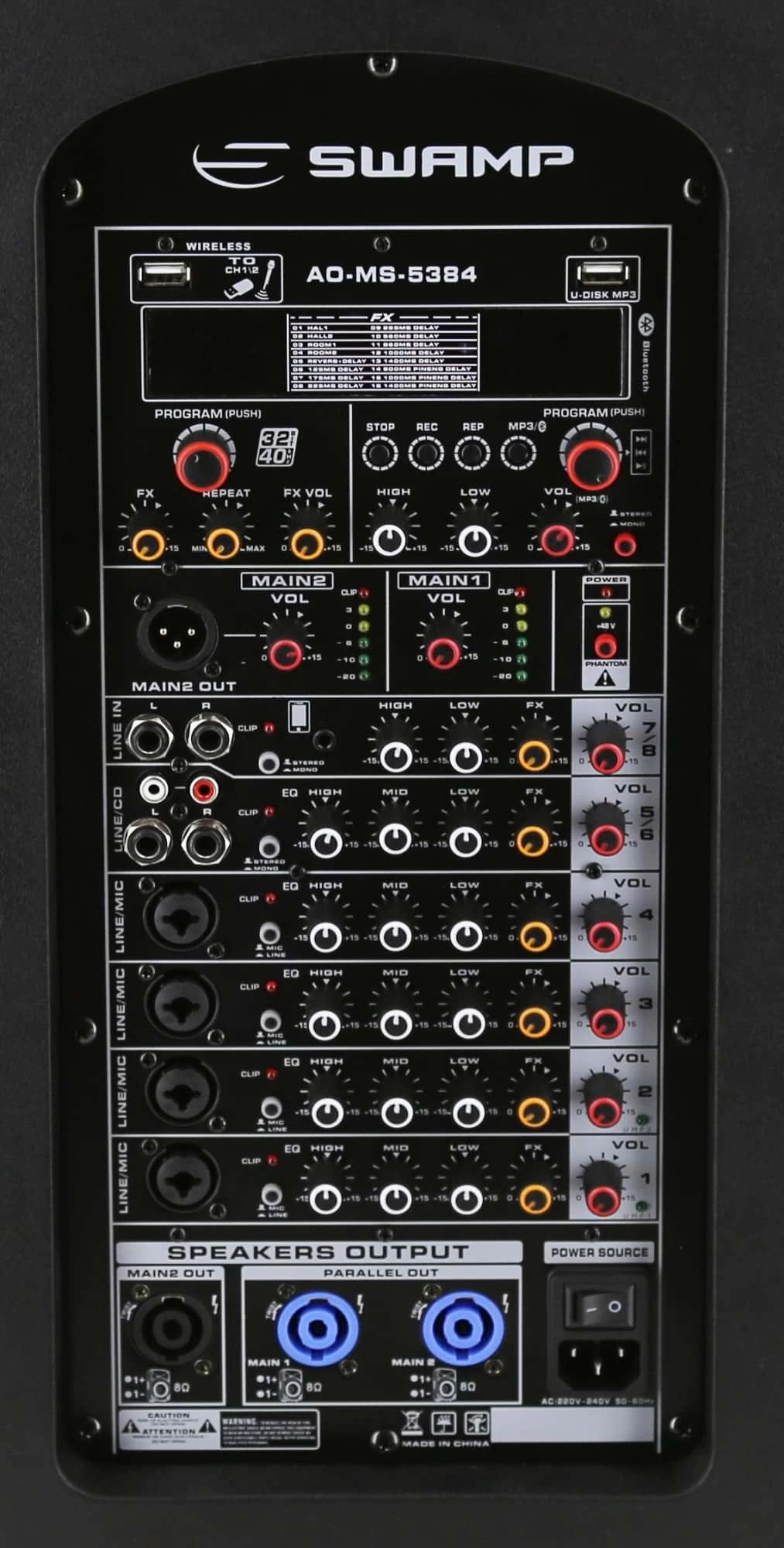 The MS-5384 has been tailored to suit simple PA speaker events involving speech and music – plug and play operation for the 2x wireless mics, and bluetooth connection for audio means setup takes a few seconds and you never need to touch the mixer again. While built-in 8 channel mixer, with 4 mic preamps, provides enough inputs for musicians and small bands directly plug into the mixer for performance. Vocalists and guitarists will appreciate the great range of 16 DSP effects and quality of the 32-bit effects engine. Other features include USB input for MP3 playback and 48V phantom power to power any condenser microphones.